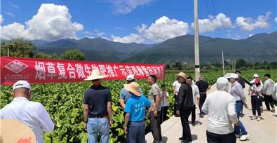 7月31日,一場由云南農業(yè)大學、洱海流域農業(yè)綠色發(fā)展研究院、大理州煙草公司聯(lián)合舉辦的致力于全面總結經驗、推動洱海流域減排、促進煙農增收并穩(wěn)定展現(xiàn)煙葉品質風格特征的煙草復合微生物肥推廣示范觀摩活動圓滿舉行。云南農業(yè)大學、大理煙草科技小院共同研制、依托科研成果轉化,由大理州企業(yè)家協(xié)會常務副會長單位——云南順豐洱海環(huán)??萍脊煞萦邢薰揪纳a的“洱?!迸茻煵輰S脧秃衔⑸锓?,在此次活動中大放異彩,吸引了眾多領導、專家、媒體以及各地相關人員前來參與、觀摩。觀摩組一行率先抵達挖色鎮(zhèn)“云 87 ”品種示范點,示范點內