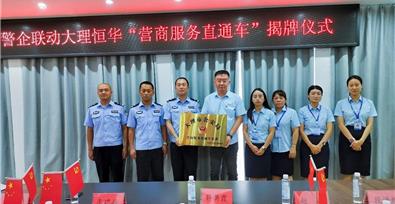 為持續(xù)優(yōu)化法治化營(yíng)商環(huán)境,全力服務(wù)保障企業(yè)健康發(fā)展,6月19日,大理市公安局經(jīng)濟(jì)開發(fā)區(qū)派出所營(yíng)商服務(wù)“直通車”揭牌儀式在大理州企業(yè)家協(xié)會(huì)副會(huì)長(zhǎng)單位——大理恒華商貿(mào)有限責(zé)任公司舉行。大理市公安局副局長(zhǎng)段巍巍、大理市公安局經(jīng)濟(jì)開發(fā)區(qū)派出所所長(zhǎng)黑杰亮及有關(guān)領(lǐng)導(dǎo)、公司董事長(zhǎng)李建兵及相關(guān)負(fù)責(zé)人參加揭牌儀式。營(yíng)商環(huán)境直通車機(jī)制是大理市公安局積極適應(yīng)高質(zhì)量發(fā)展新形勢(shì)、新要求,主動(dòng)識(shí)變、求變,在機(jī)制上提升新質(zhì)公安戰(zhàn)斗力的重要舉措。段巍巍副局長(zhǎng)表示,開通營(yíng)商服務(wù)“直通車”,要通過(guò)警企共建、警務(wù)宣傳、嚴(yán)打護(hù)企、所長(zhǎng)問(wèn)企、精簡(jiǎn)