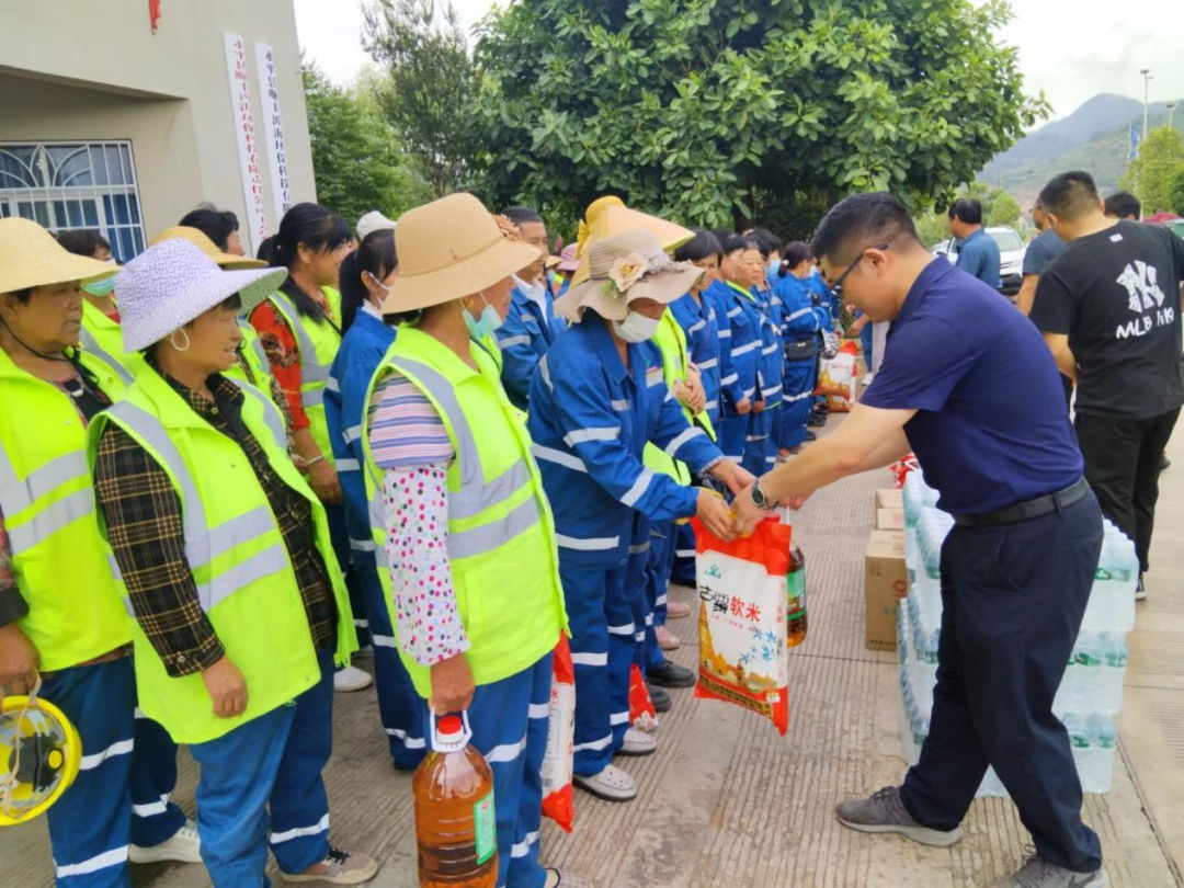 為一線環(huán)衛(wèi)工人發(fā)放大米、食用油等慰問物品。