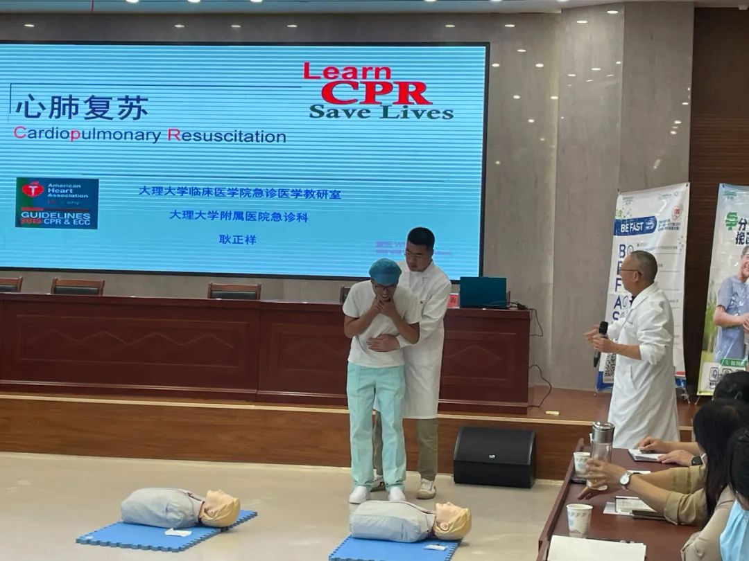 其次,大理大學第一附屬醫(yī)院內科一支部及急診科人員進行心肺復蘇演示。