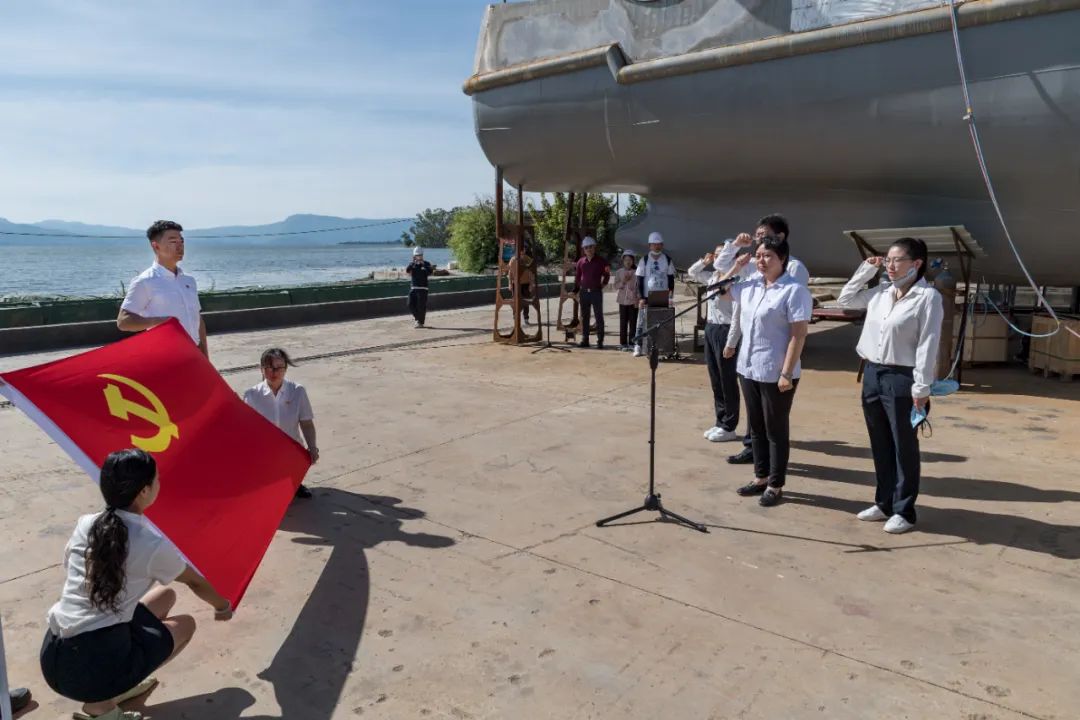 公司黨委創(chuàng)新活動形式,將宣誓地點(diǎn)定在桃源碼頭268客位新能源船舶更新建造項(xiàng)目上。今年新入黨的預(yù)備黨員在洱海畔面向黨旗莊嚴(yán)宣誓,公司黨委委員、副總經(jīng)理陶婷同志領(lǐng)誓,在場的全體黨員共同重溫了入黨誓詞。宣誓結(jié)束后,參加活動的全體人員共同參與了268客位新能源船舶更新建造項(xiàng)目的調(diào)研。