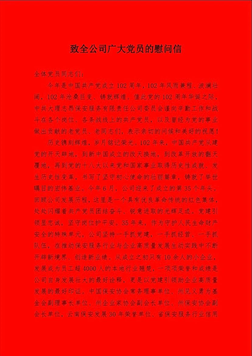 為使廣大基層執(zhí)勤崗位黨員職工深切感受到以習近平同志為核心的黨中央的關懷和溫暖,使慰問的過程成為凝心聚力、振奮精神、推動工作的過程,引導廣大黨員職工開拓進取、奮發(fā)有為,推動保安服務行業(yè)與企業(yè)高質量發(fā)展。7月4日,大理州企業(yè)家協(xié)會副會長單位——大理志昂保安公司黨委在公司黨群活動中心組織召開慶祝中國共產(chǎn)黨成立 102 周年系列活動暨慰問一線崗位黨員座談會。公司黨委書記劉志杰、在家的班子成員出席座談會,保安員、消防員、警務輔助人員等30名來自一線崗位的黨員代表參加座談會。