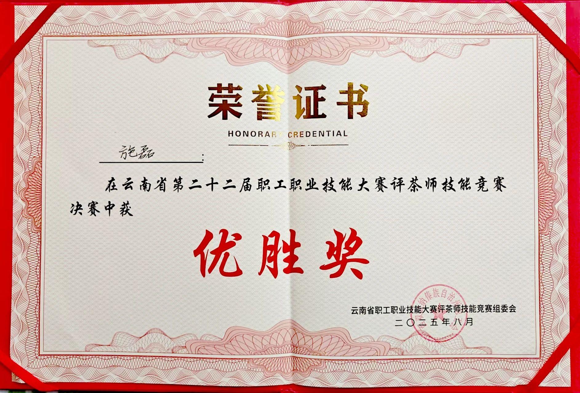 下關(guān)沱茶集團公司員工施磊榮獲“云南省第22屆職工職業(yè)技能大賽”評茶師技能競賽優(yōu)勝獎
