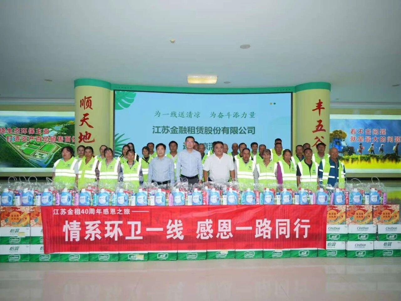 江蘇金租領(lǐng)導(dǎo)一行為一線環(huán)衛(wèi)工人發(fā)放飲用水、金龍魚大禮包、洗漱包等慰問品。
