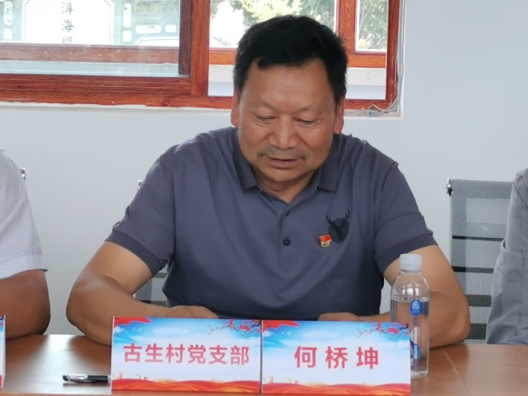 古生村黨支部書記何橋坤介紹支部發(fā)展情況及集體經(jīng)濟(jì)發(fā)展信貸需求。