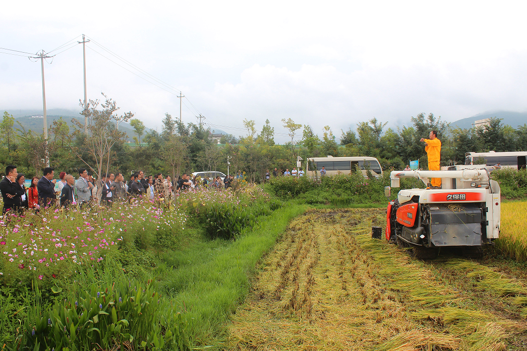 緊接著,全體會員代表又來到位于鳳儀鎮(zhèn)華營的大理州企業(yè)家協(xié)會會員單位——大理榮江生態(tài)農(nóng)業(yè)發(fā)展有限公司種植基地,現(xiàn)場考察參觀高效生態(tài)的農(nóng)業(yè)示范基地建設(shè)現(xiàn)場,同公司的員工一同共慶第五個(gè)農(nóng)民豐收節(jié)。大理榮江生態(tài)農(nóng)業(yè)示范基地位于鳳儀鎮(zhèn)華營村,放眼望去,即將收割連片2000多畝的稻田一片金黃,在微風(fēng)的吹拂下,稻浪翻滾,長勢喜人,蔚為壯觀,一派豐收在望的景象。在考察參觀現(xiàn)場,企業(yè)家們聽取了企業(yè)負(fù)責(zé)人對生態(tài)農(nóng)業(yè)示范基地建設(shè)、產(chǎn)品市場開拓以及種業(yè)基地打造情況的簡要介紹,并在公司負(fù)責(zé)人的引領(lǐng)下,沿著田間的機(jī)耕道參觀了機(jī)械化收割、稻田漁鴨共生現(xiàn)場。