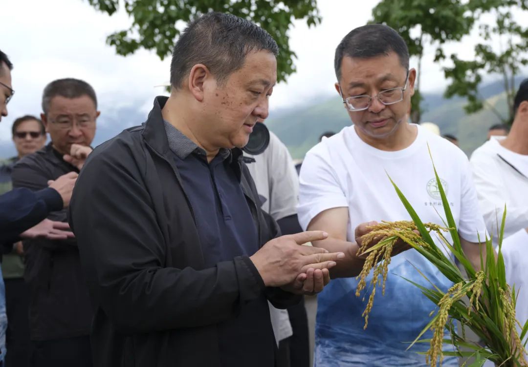 調(diào)研現(xiàn)場,楊國宗認(rèn)真聽取情況匯報,仔細(xì)詢問專家意見建議,并與基地負(fù)責(zé)人細(xì)算水稻增產(chǎn)、增收賬。