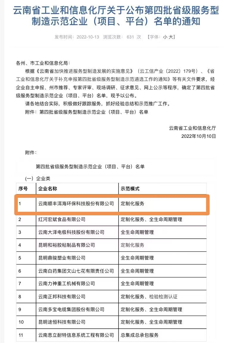 云南順豐洱海環(huán)??萍脊煞萦邢薰颈淮_定為云南省服務(wù)型制造示范企業(yè)