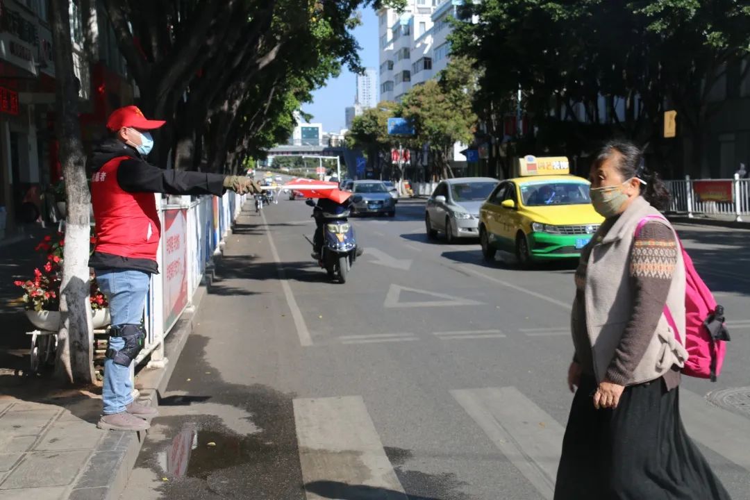 在下關(guān)城區(qū)重點(diǎn)路段都能看到志愿者們的身影,他們身穿紅色馬甲,頭戴志愿帽,手持“文明勸導(dǎo)”交通指揮旗,從早上7點(diǎn)到下午7點(diǎn),在凜冽寒風(fēng)與灼灼烈日下堅(jiān)守在文明勸導(dǎo)崗位上,協(xié)助交警維持交通秩序,勸導(dǎo)行人在人行道內(nèi)行走,不闖紅燈、不隨意橫過道路,不翻越隔離護(hù)欄等,營造了安全暢通的交通環(huán)境。