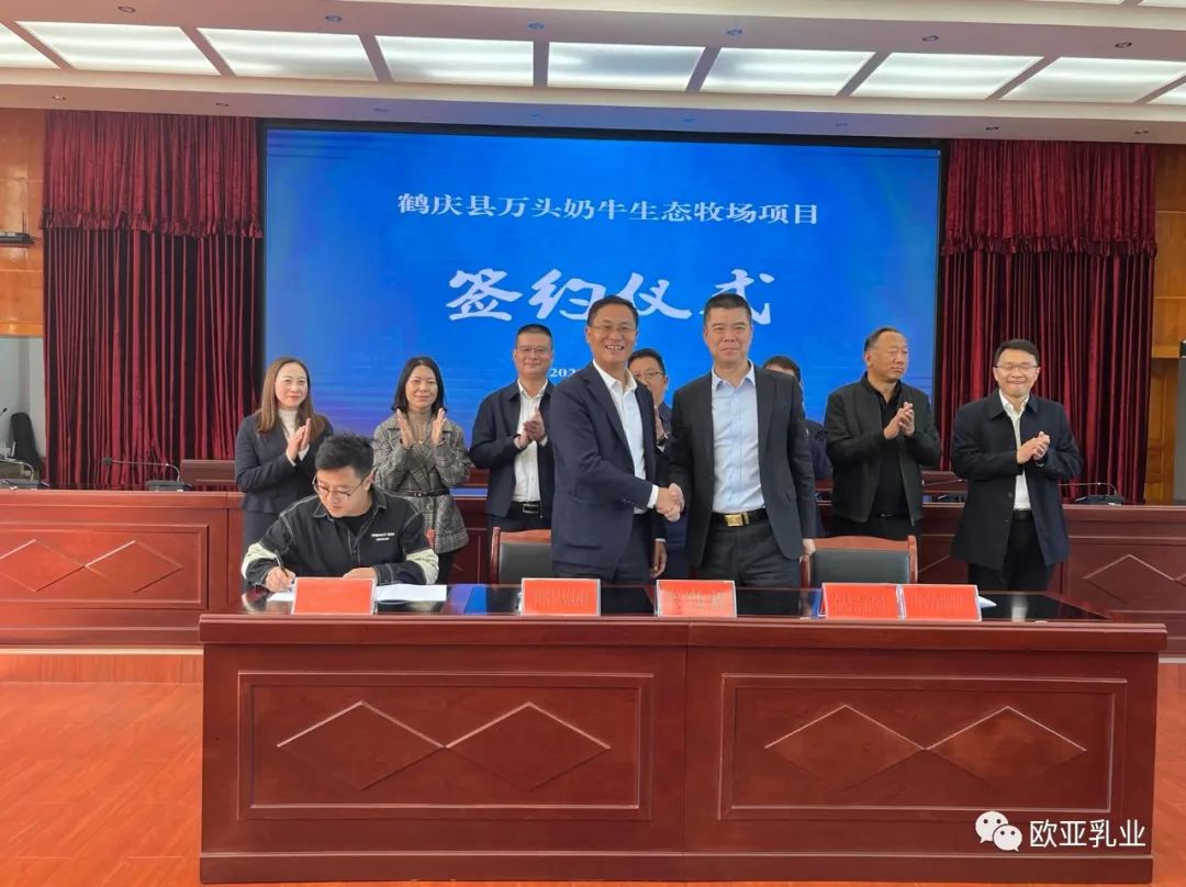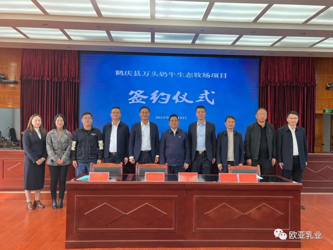 為加快綠色奶源基地建設(shè),提高優(yōu)質(zhì)原料奶供應(yīng)量,大理州企業(yè)家協(xié)會(huì)理事單位——云南歐亞乳業(yè)有限公司繼2015年在鶴慶縣金墩鄉(xiāng)北溪村投資建設(shè)萬(wàn)頭國(guó)家級(jí)奶牛標(biāo)準(zhǔn)化示范場(chǎng)后,11月8日,又與鶴慶縣政府簽定投資協(xié)議,新建一個(gè)存欄11000頭娟姍奶牛的有機(jī)生態(tài)牧場(chǎng)。大理州政府黨組成員、一級(jí)巡視員吉向陽(yáng),鶴慶縣四班子領(lǐng)導(dǎo),縣級(jí)相關(guān)部門(mén)負(fù)責(zé)人等領(lǐng)導(dǎo)出席儀式,歐亞乳業(yè)公司董事長(zhǎng)彭金國(guó)及管理人員參加儀式。