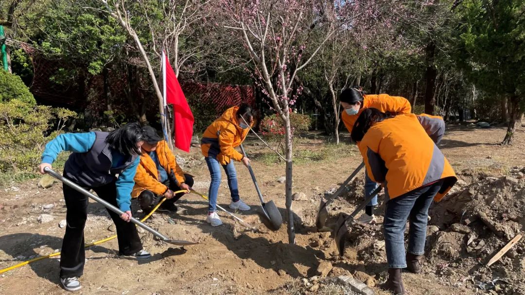 在大家共同努力下,40棵桃樹全部種植完成。有的同志手上磨出了血泡、有的同志累得直不起腰、抬不動胳膊,大家沒有一句怨言,看著這一片桃林,嘴角洋溢出了欣慰的笑容。放眼望去,一棵棵樹苗錯落有致、迎風挺立,陽光下一片初生的桃林迎風招展,煥發(fā)盎然生機。